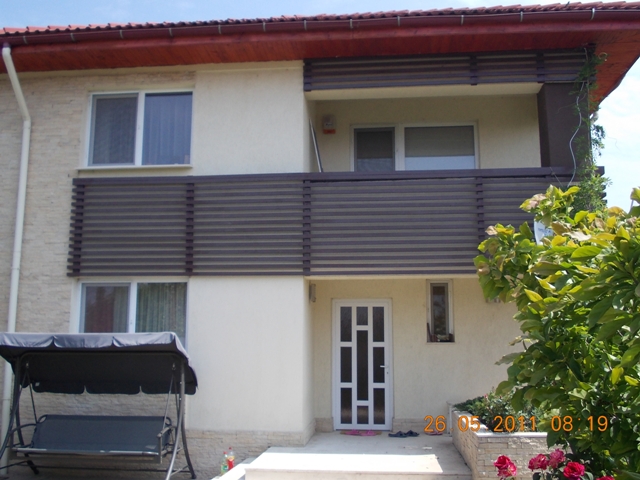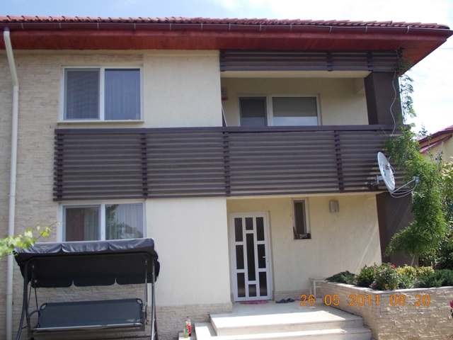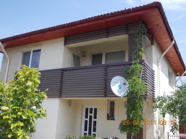 Realizare proiect balustrada din lemn exterioara ,model cu laterale asezate orizontal.Balustrada din lemn de brad exterioara brad, finisaj exterior, tratament in Sadolin.Modelul a fost realizat cu elemente uscate din brad, 50 mm x 25 mm.