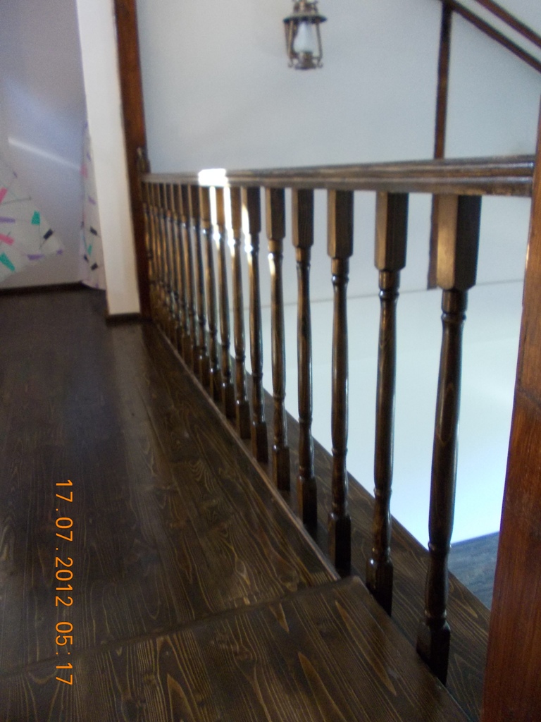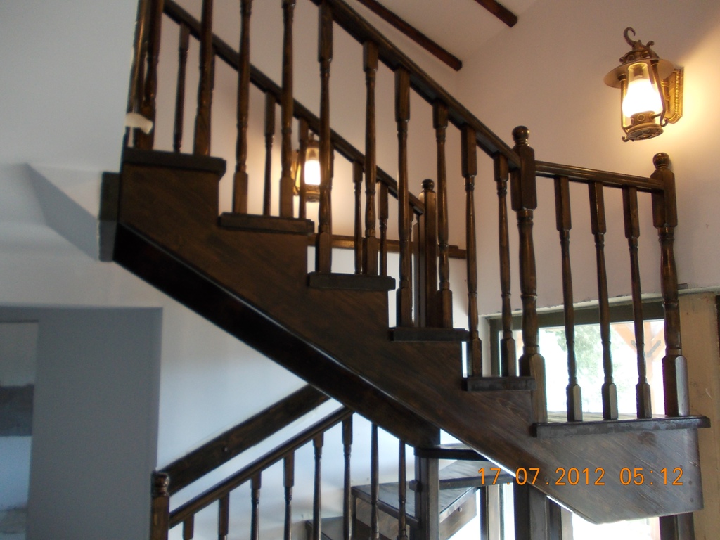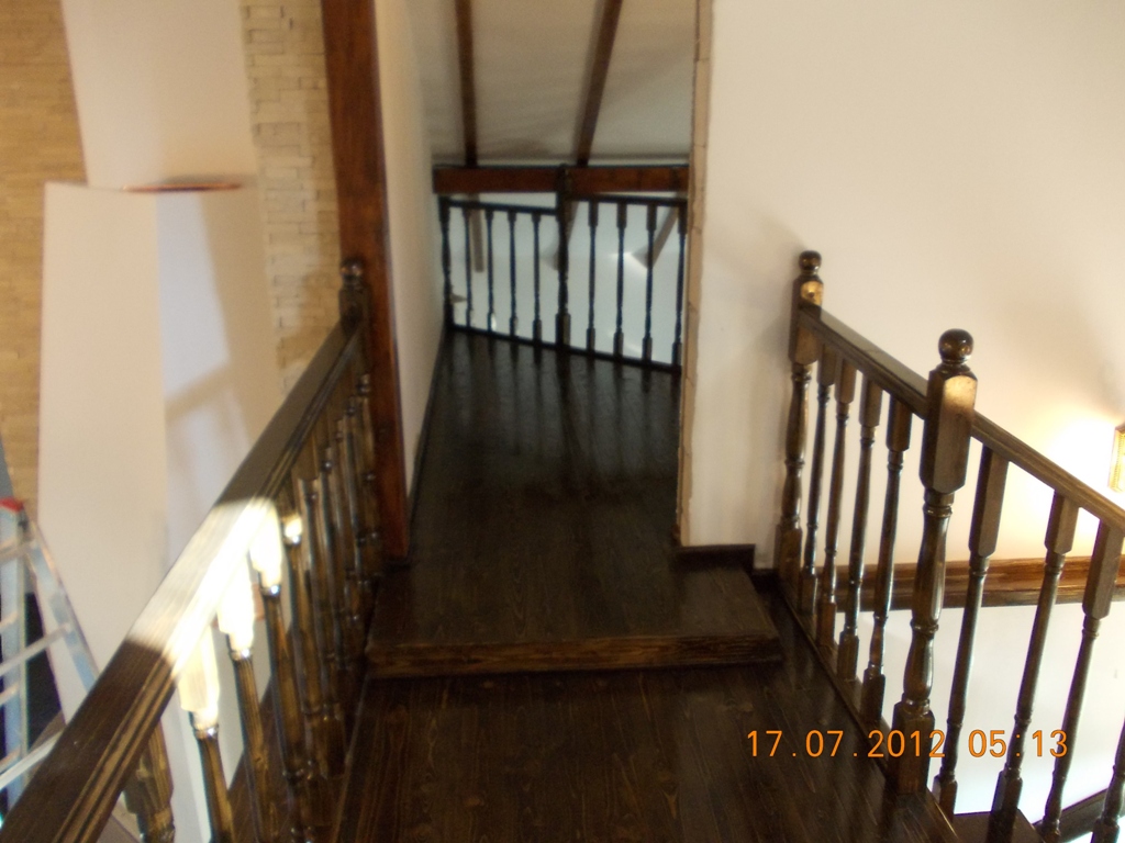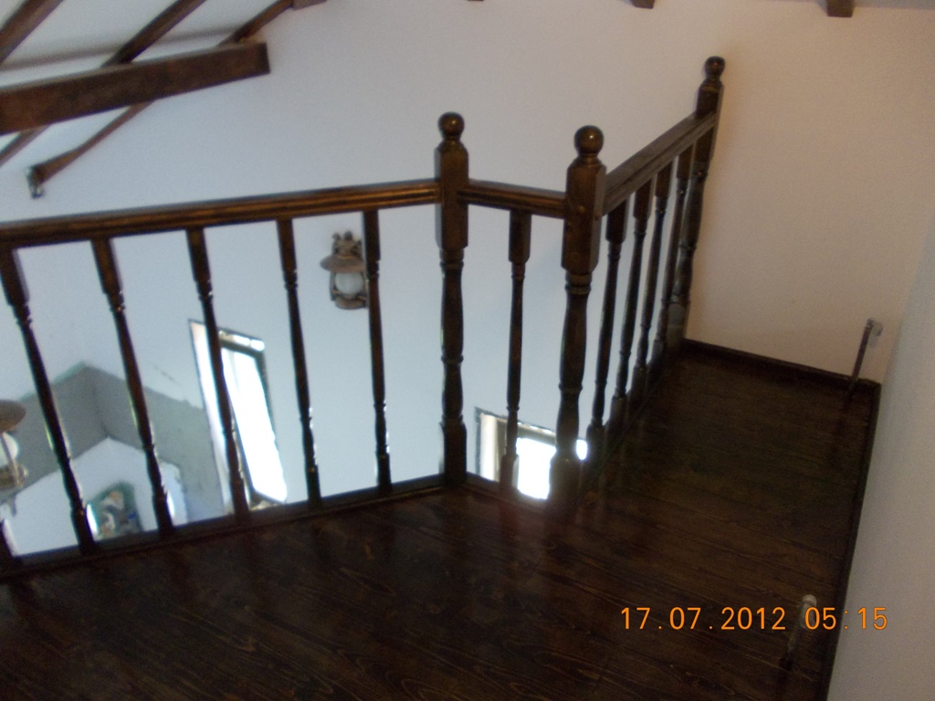 Balustrada din lemn de brad, cu balustrii din lemn strunjiti , aferenti inchiderii golulului de scara cat si protectie balustrada. Finisaj nuc inchis, lac parchet cerat.