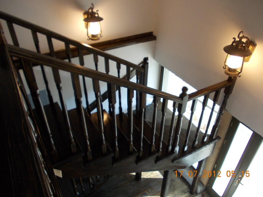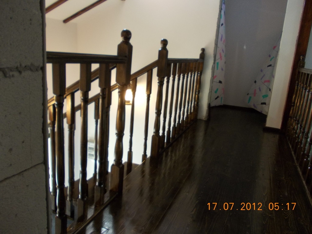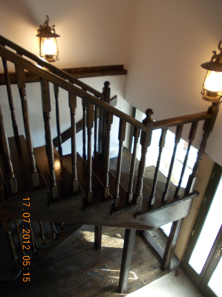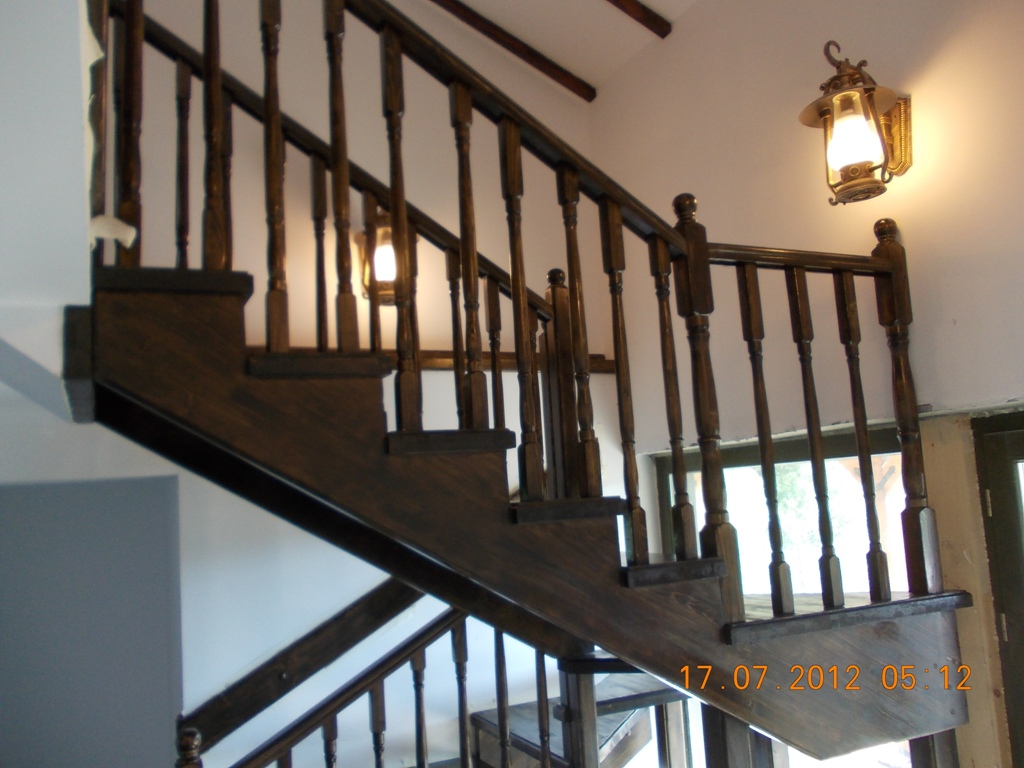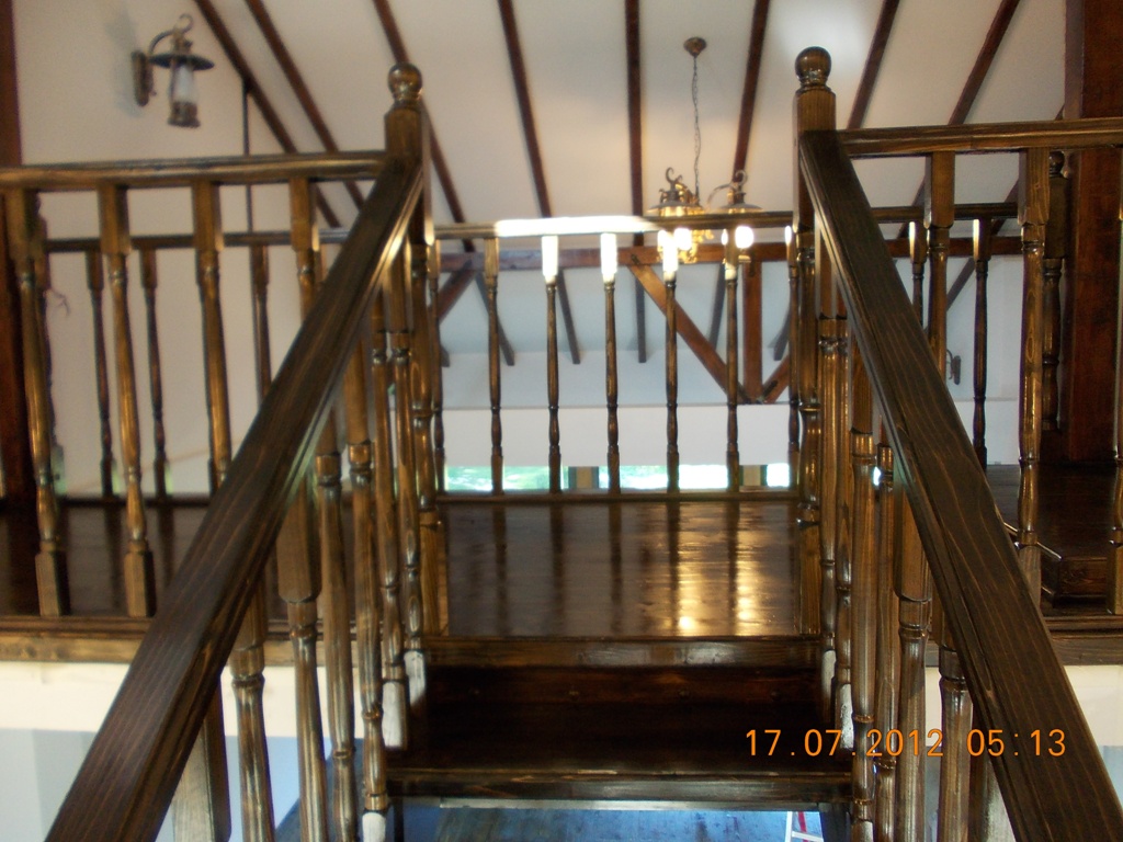 Balustrada din lemn de brad, cu balustrii din lemn strunjiti , aferenti inchiderii golulului de scara cat si protectie balustrada. Finisaj nuc inchis, lac parchet cerat.