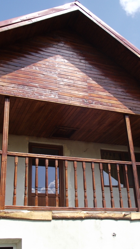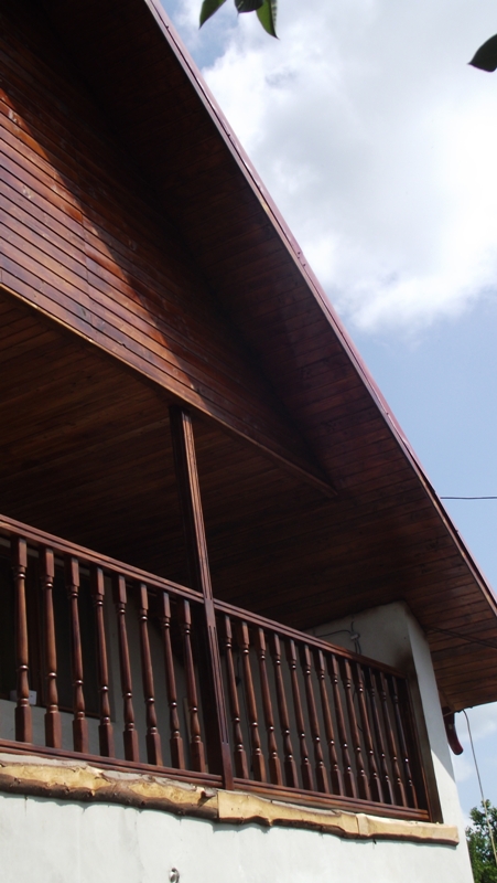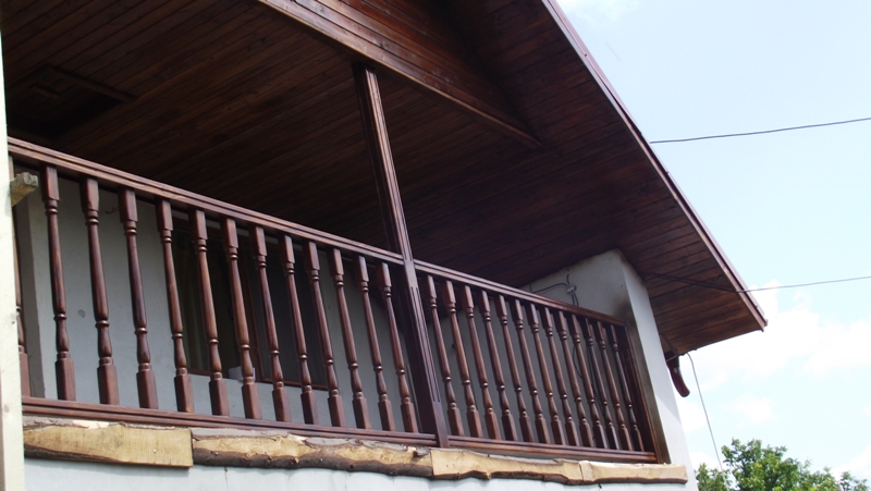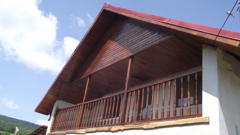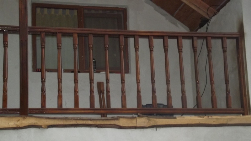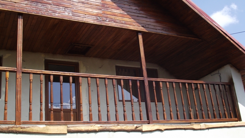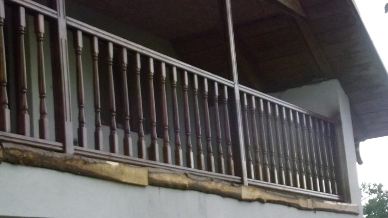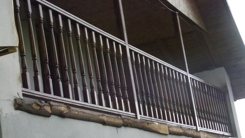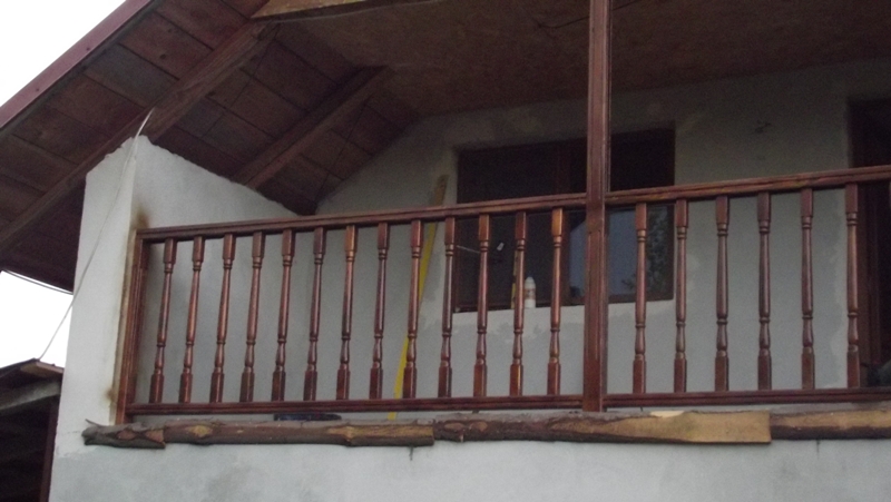Balustrada exterioara din lemn masiv de brad cu balustrii din lemn strunjii , model 2 veze . Mana curenta din lemn masiv de brad, suport balustru si stalp sustinere frezat , in finisaj nuc. Tratament specific de exterior cu Sadolin. Balustrada exterioara din brad , lucrare executata in Vladeni,jud.Vaslui.