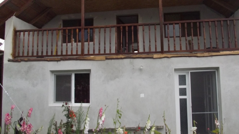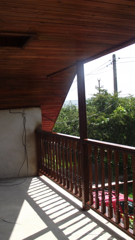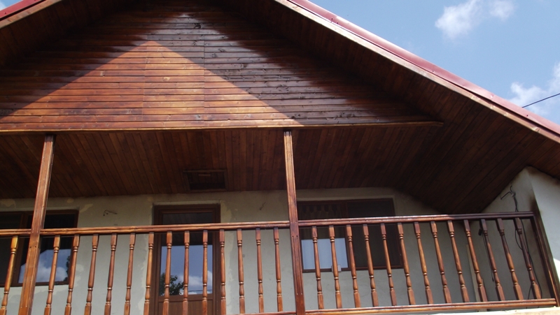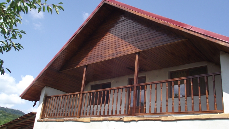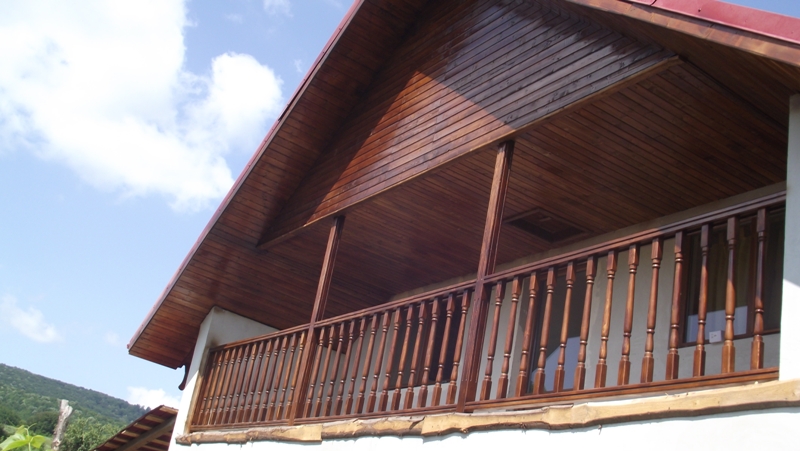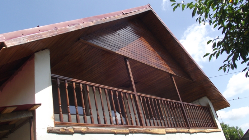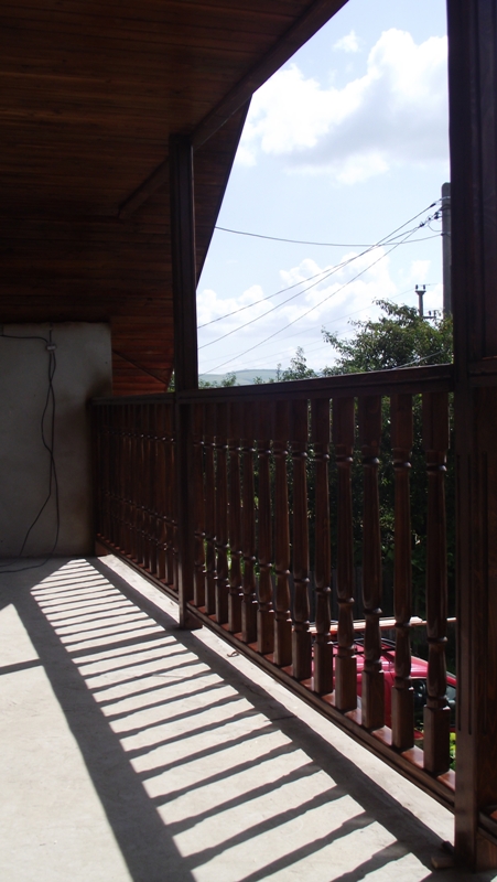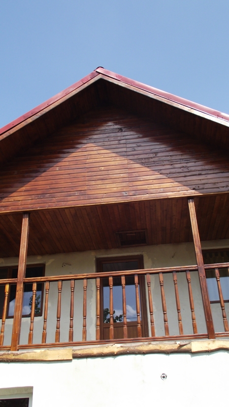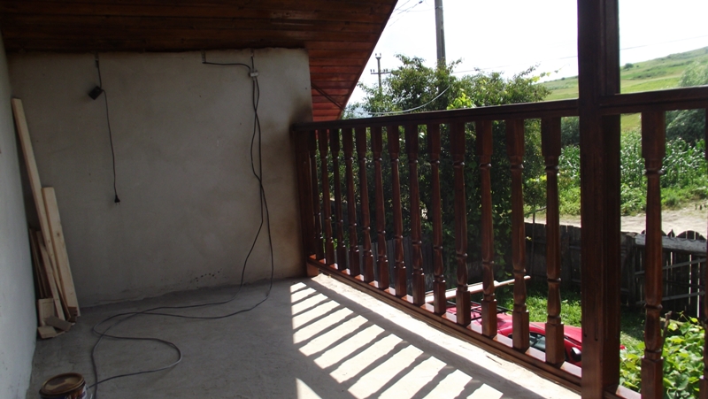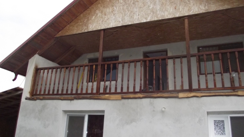 Balustrada exterioara din lemn masiv de brad cu balustrii din lemn strunjii , model 2 veze . Mana curenta din lemn masiv de brad, suport balustru si stalp sustinere frezat , in finisaj nuc. Tratament specific de exterior cu Sadolin. Balustrada exterioara din brad , lucrare executata in Vladeni,jud.Vaslui.