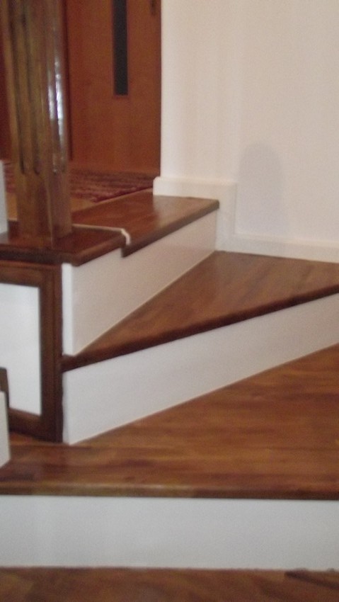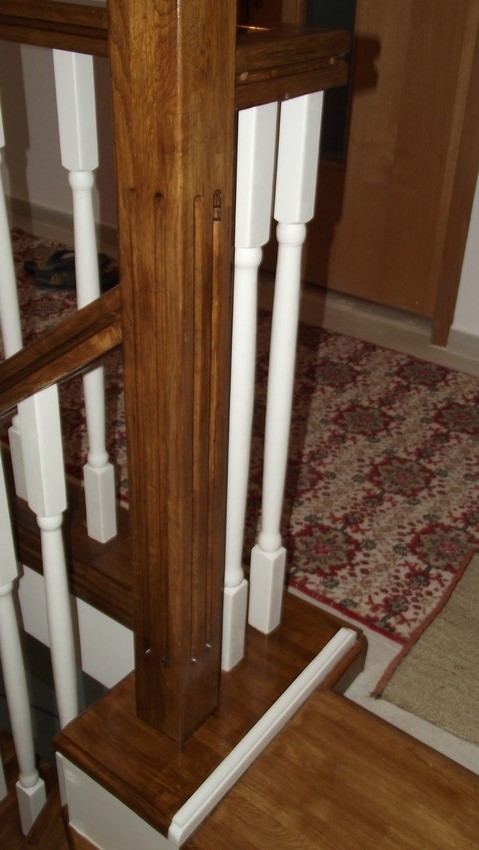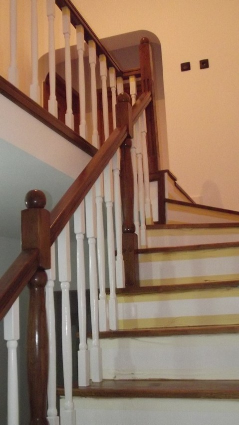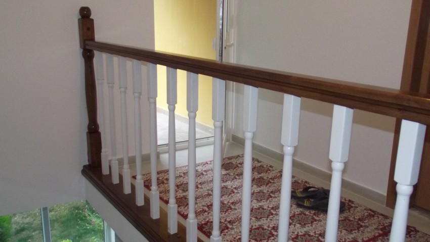 Balustrada interioara scara stejar , finisaj in 2 culori. Balustrada din lemn de stejar , model cu balustrii strunjiti , avand balustrii intermediari strnjiti in finisaj alb si baluatrii de capat finisaj nuc. Montaj pe treapta cu cep din lemn si holsurub in mana curenta. La etaj balustrada din lemn terminala. Pe fiecare treapta din lemn sunt montati 2 balustrii intermediari.
