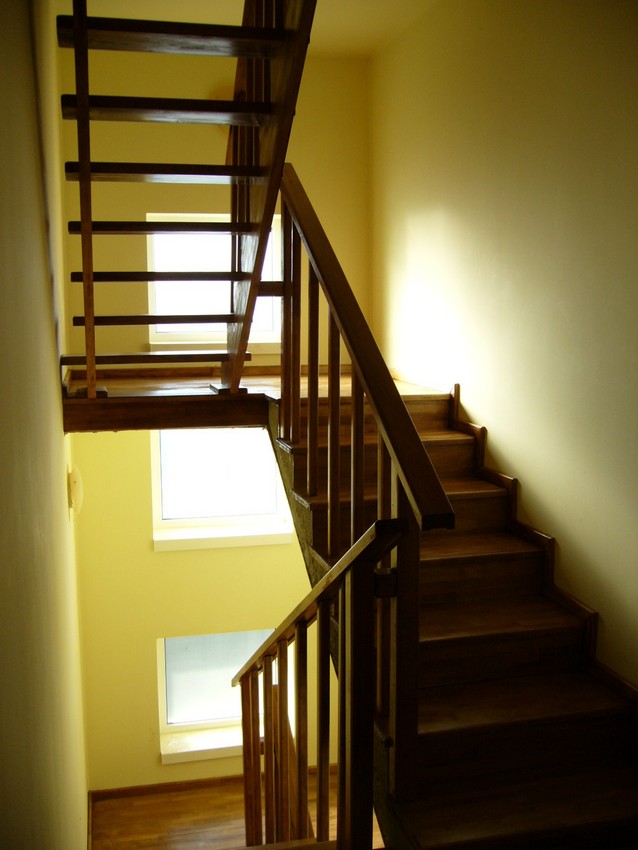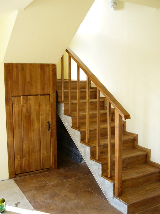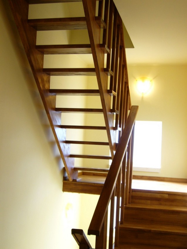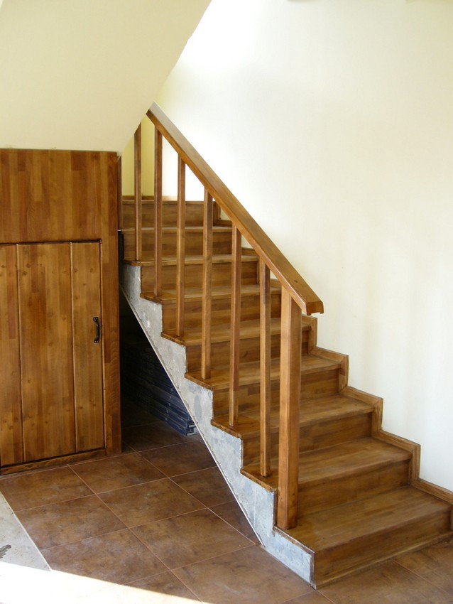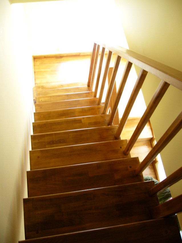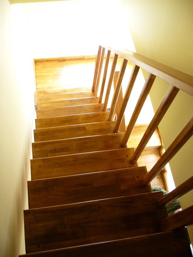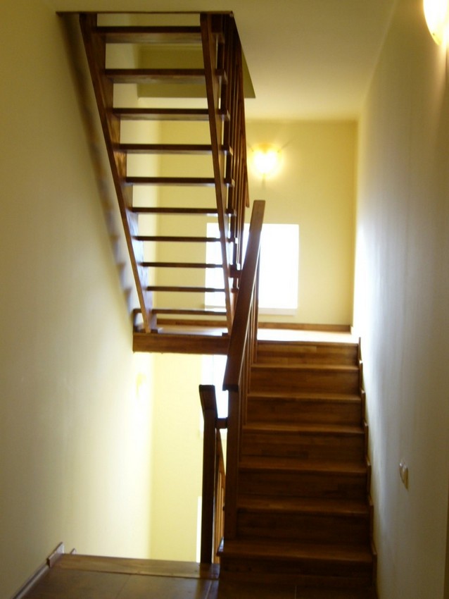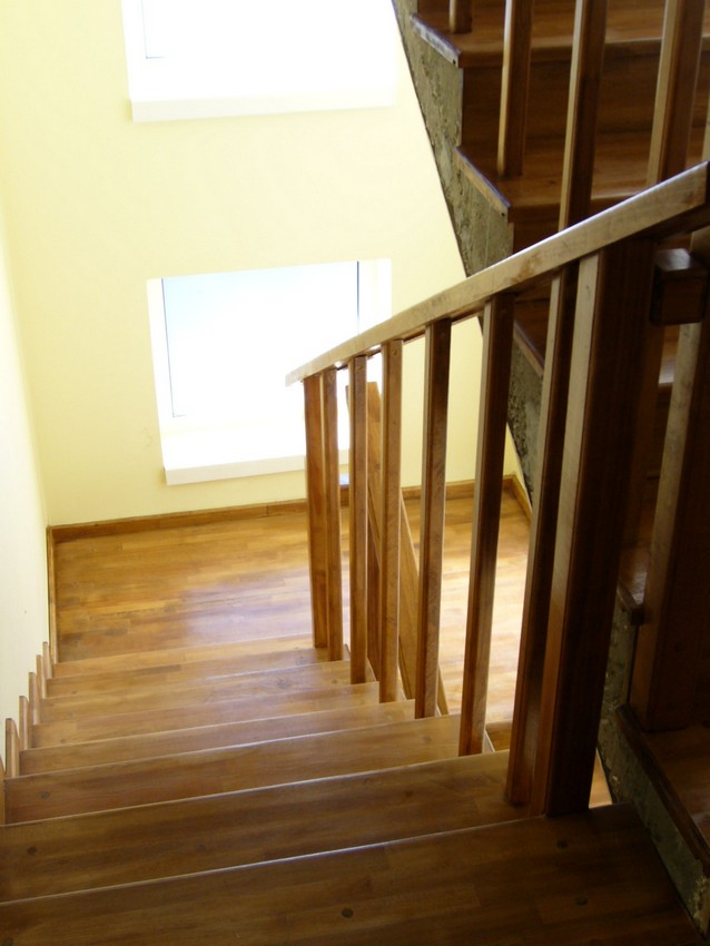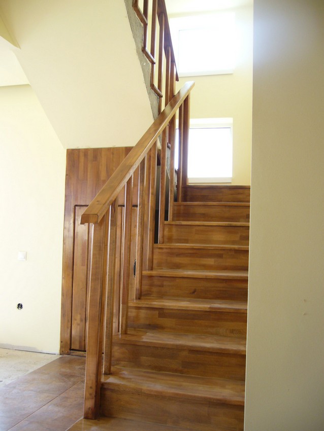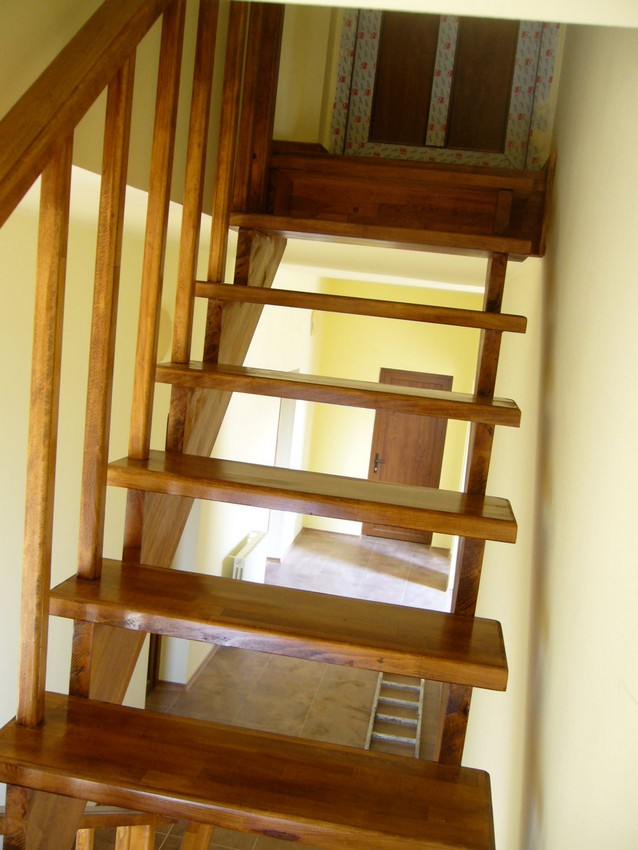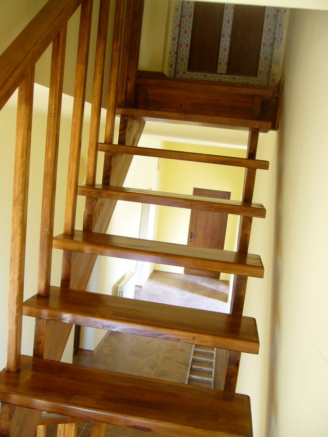 Deasemenea s-a executat si o scara din lemn pe vanguri dreapta ptr. acces in mansarda. Sub prima rampa de beton s-a facut o usa , spatiul folosit pe post de debara. Balustrada din lemn aleasa de proprietar este simpla , mana curenta peste balustrul de capat , balustrii interemdiari drepti , totul in finisaj nuc deschis ,ac parchet semimat.