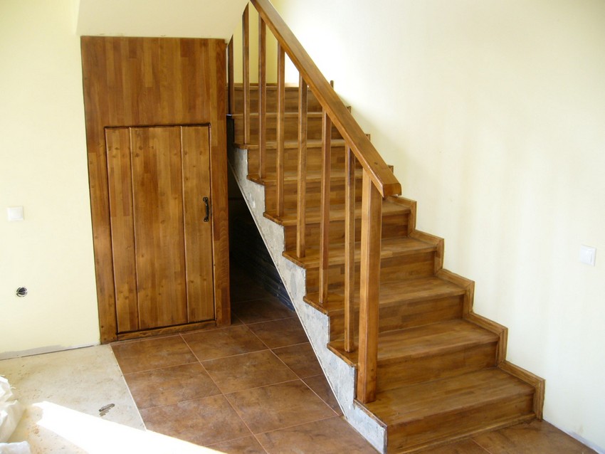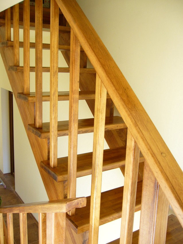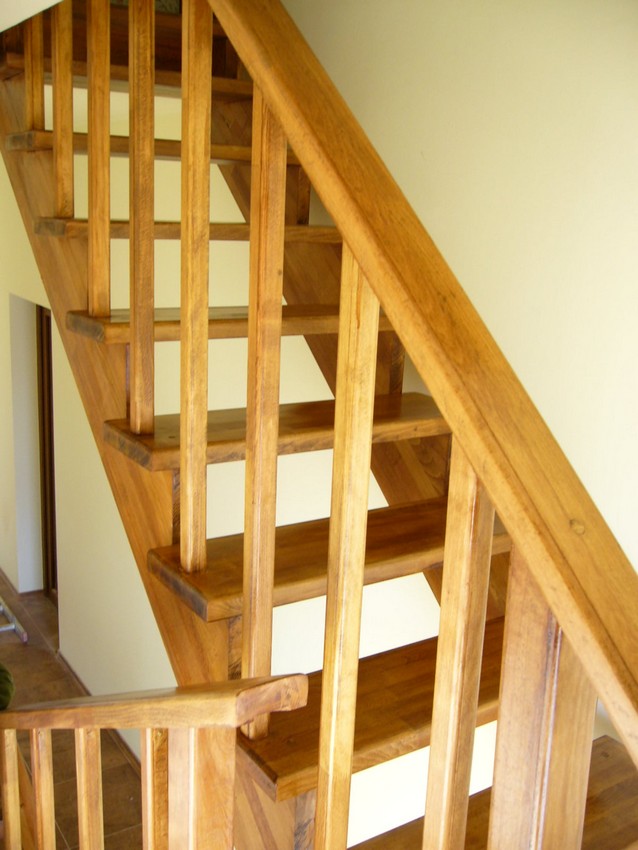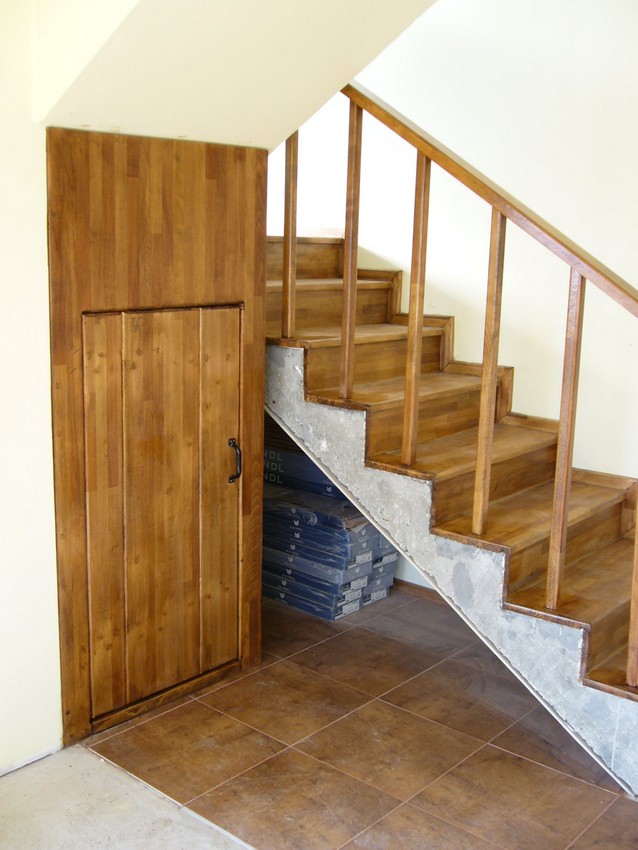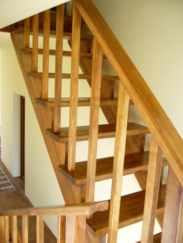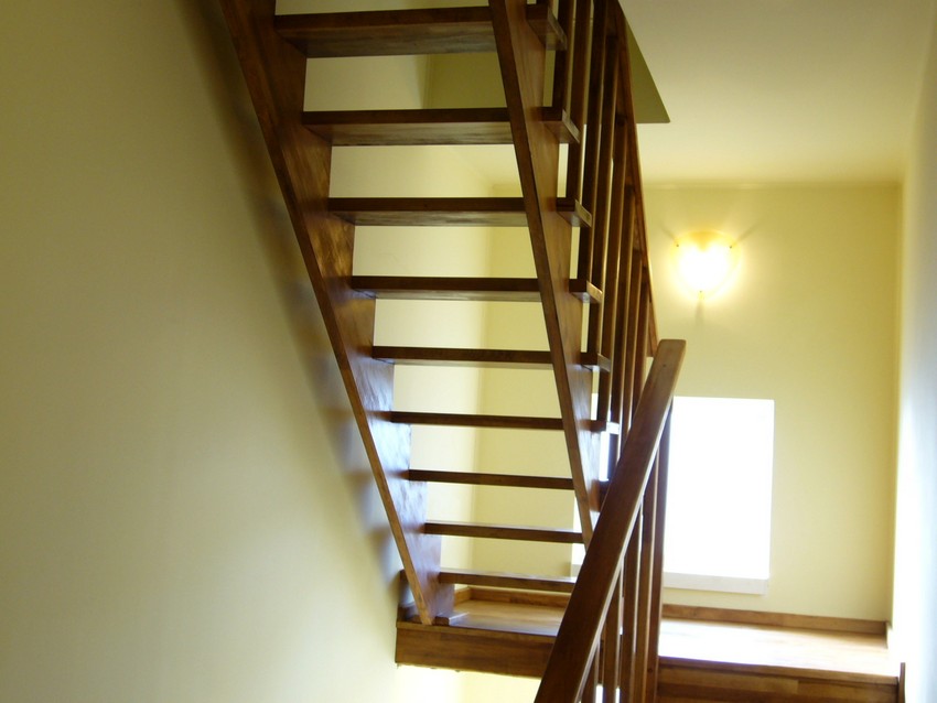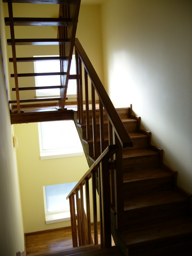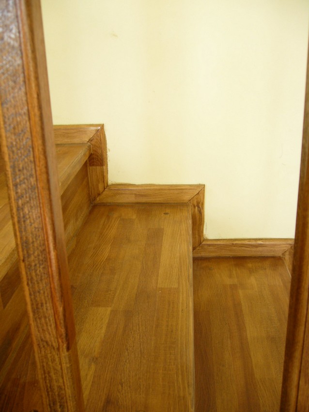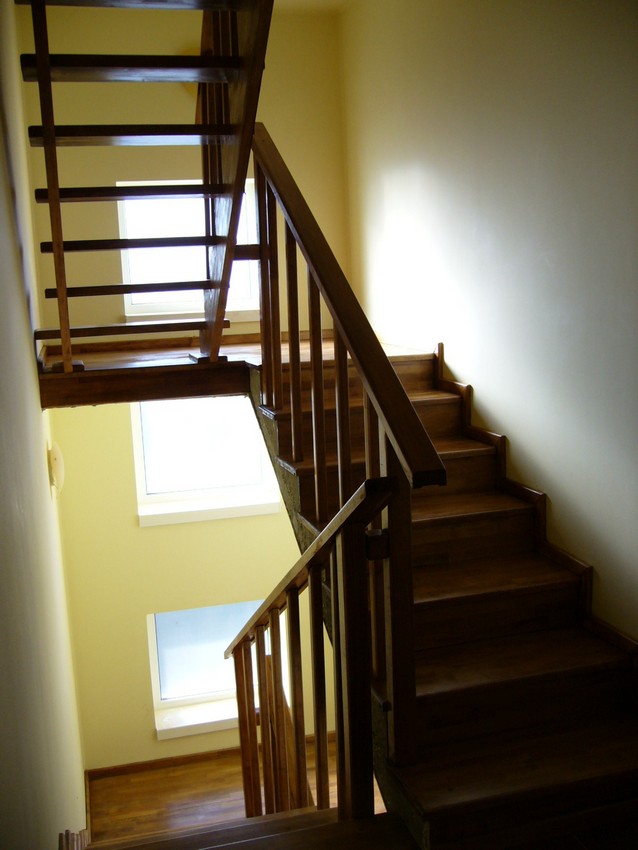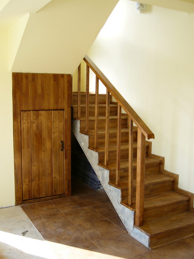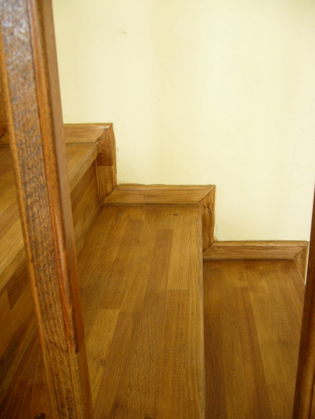 Deasemenea s-a executat si o scara din lemn pe vanguri dreapta ptr. acces in mansarda. Sub prima rampa de beton s-a facut o usa , spatiul folosit pe post de debara. Balustrada din lemn aleasa de proprietar este simpla , mana curenta peste balustrul de capat , balustrii interemdiari drepti , totul in finisaj nuc deschis ,ac parchet semimat.
