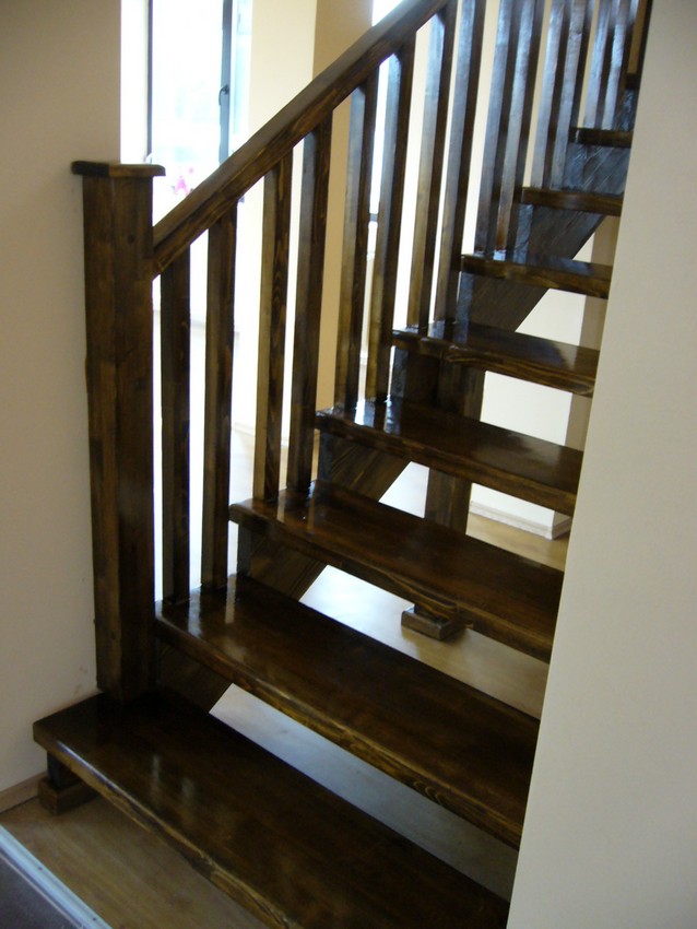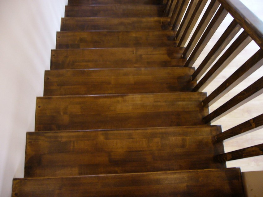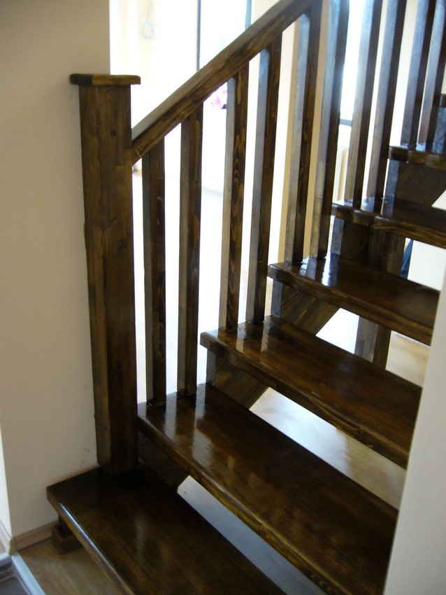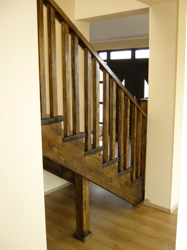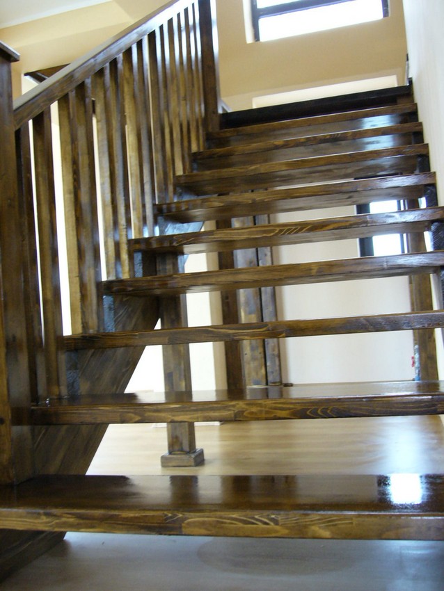 Balustrada din lemn de brad cu balustrii intermediari drepti, finisaj wenge si lac de parchet cerat.
